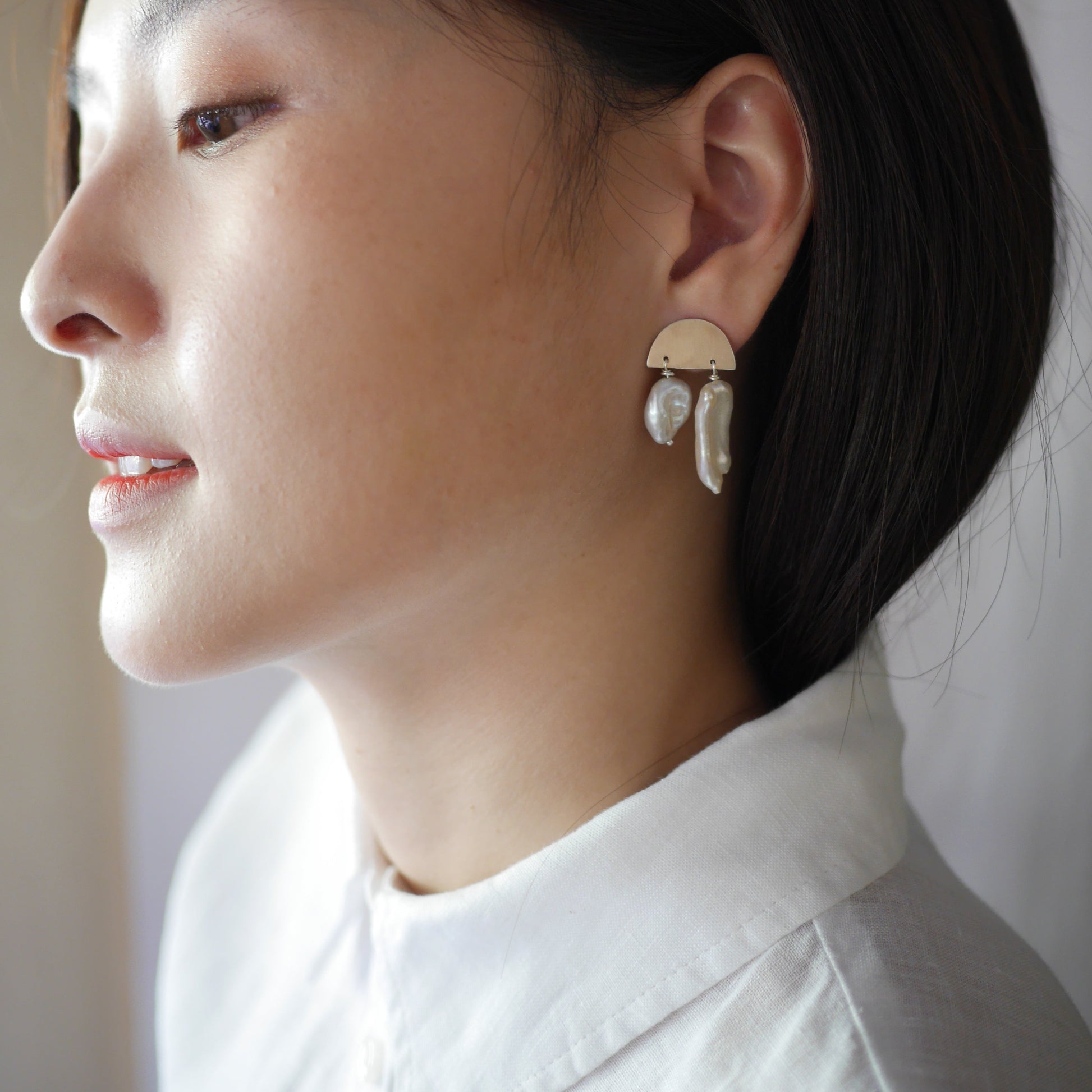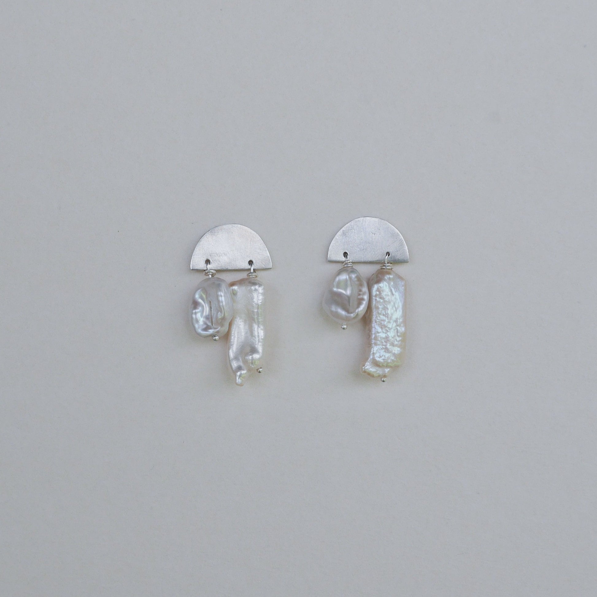 Mia earrings, a fusion of shiny silver and two varying sizes of freshwater pearls for a unique appeal