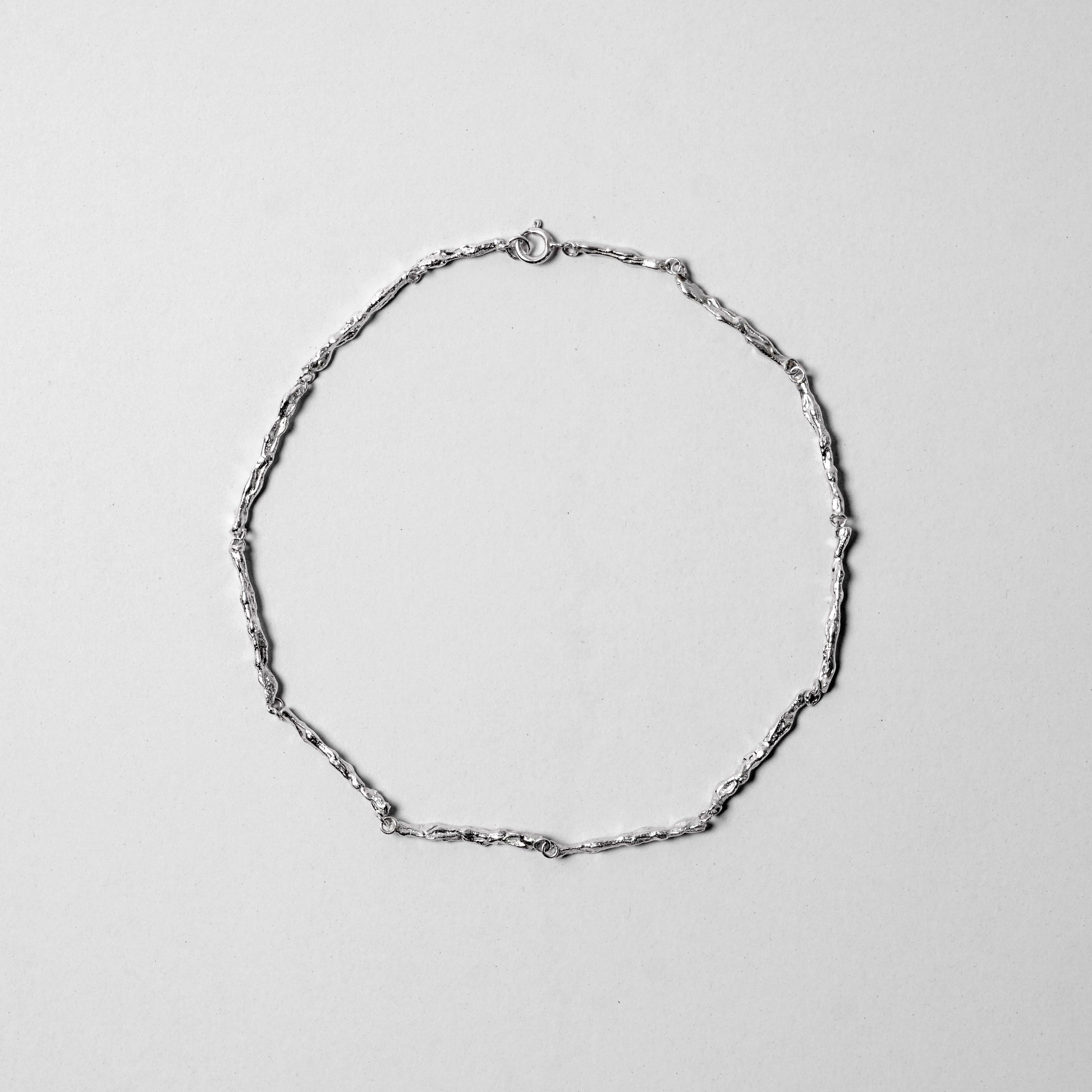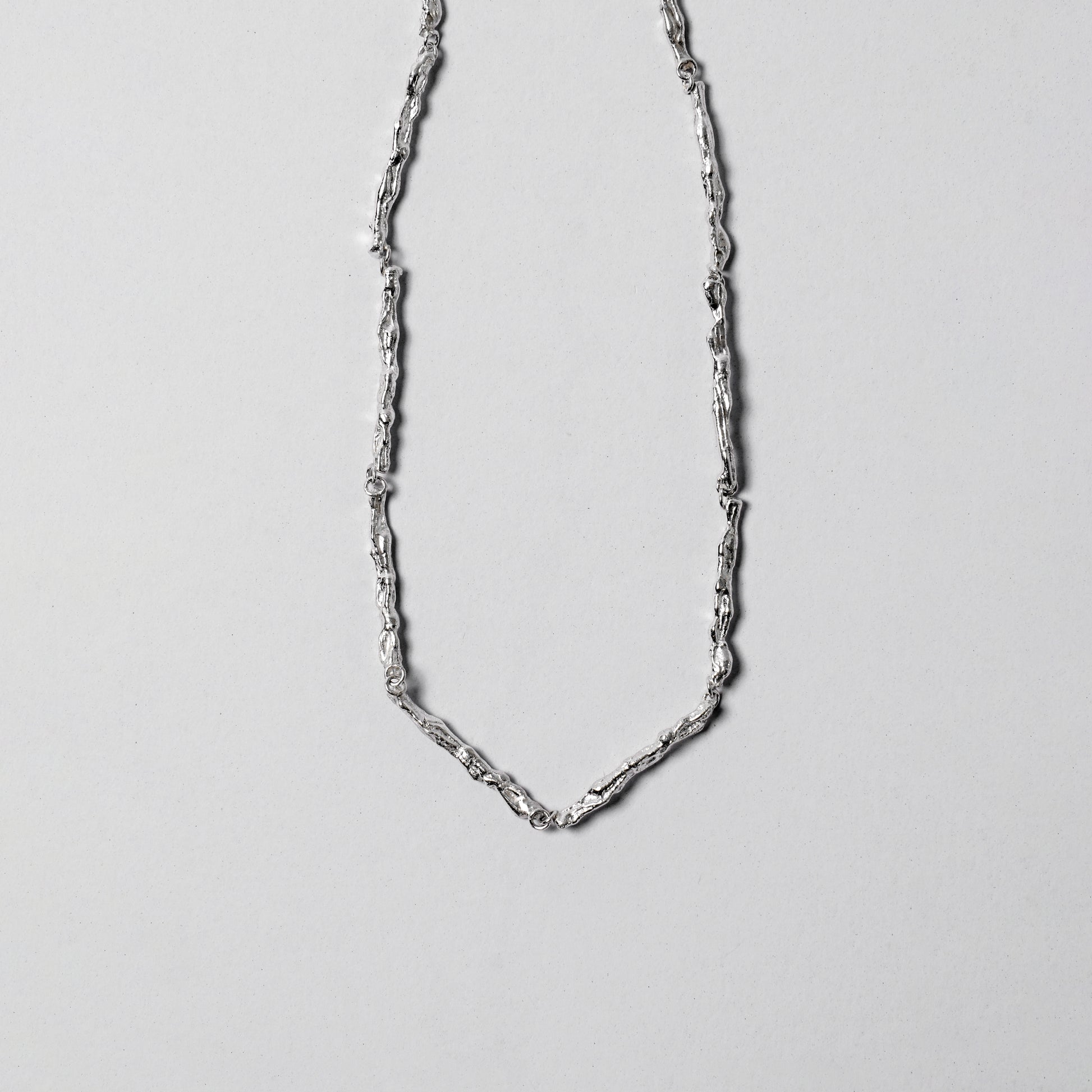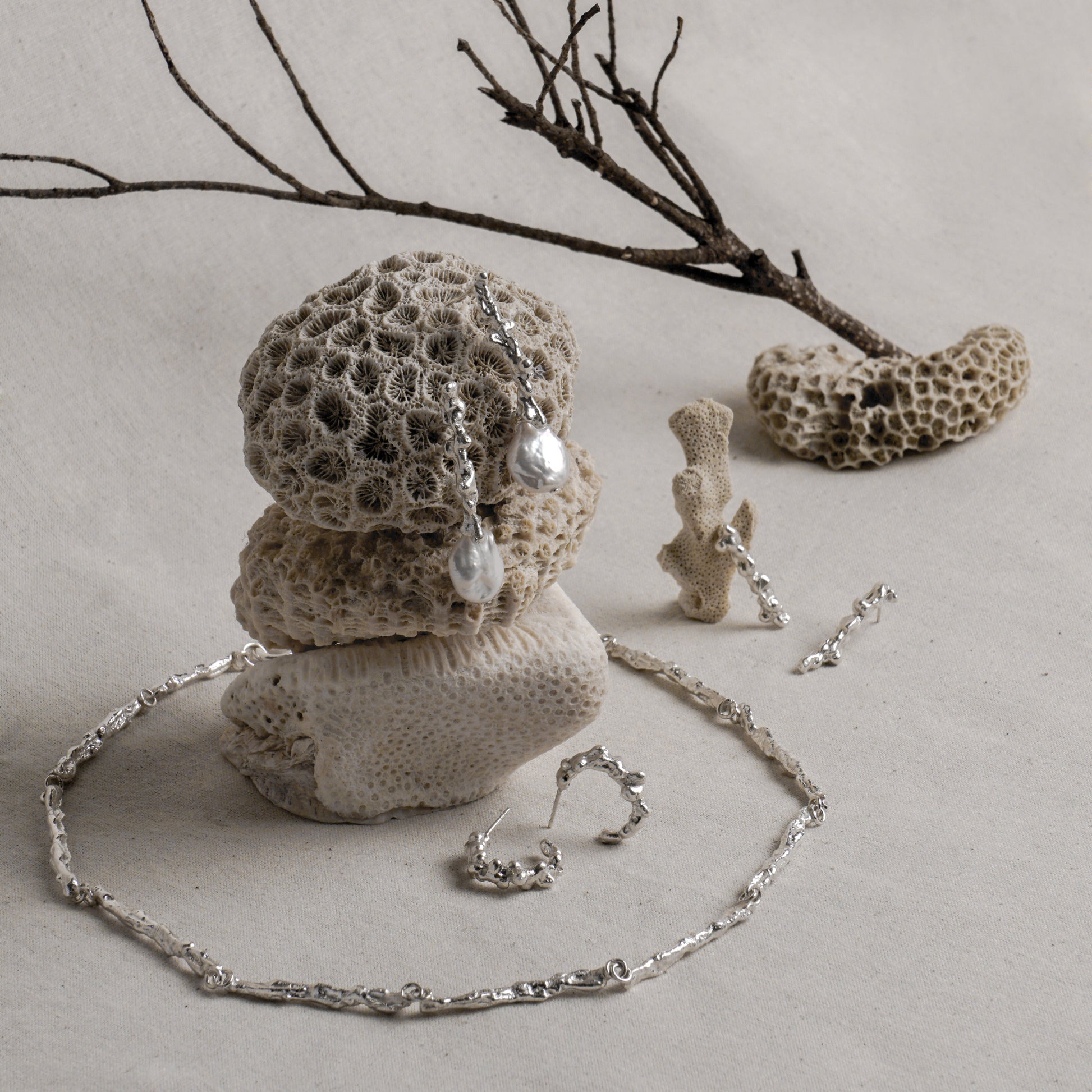 The Fluid Grace necklace, crafted from recycled fine silver, embody the serene elegance of fluid organic lines