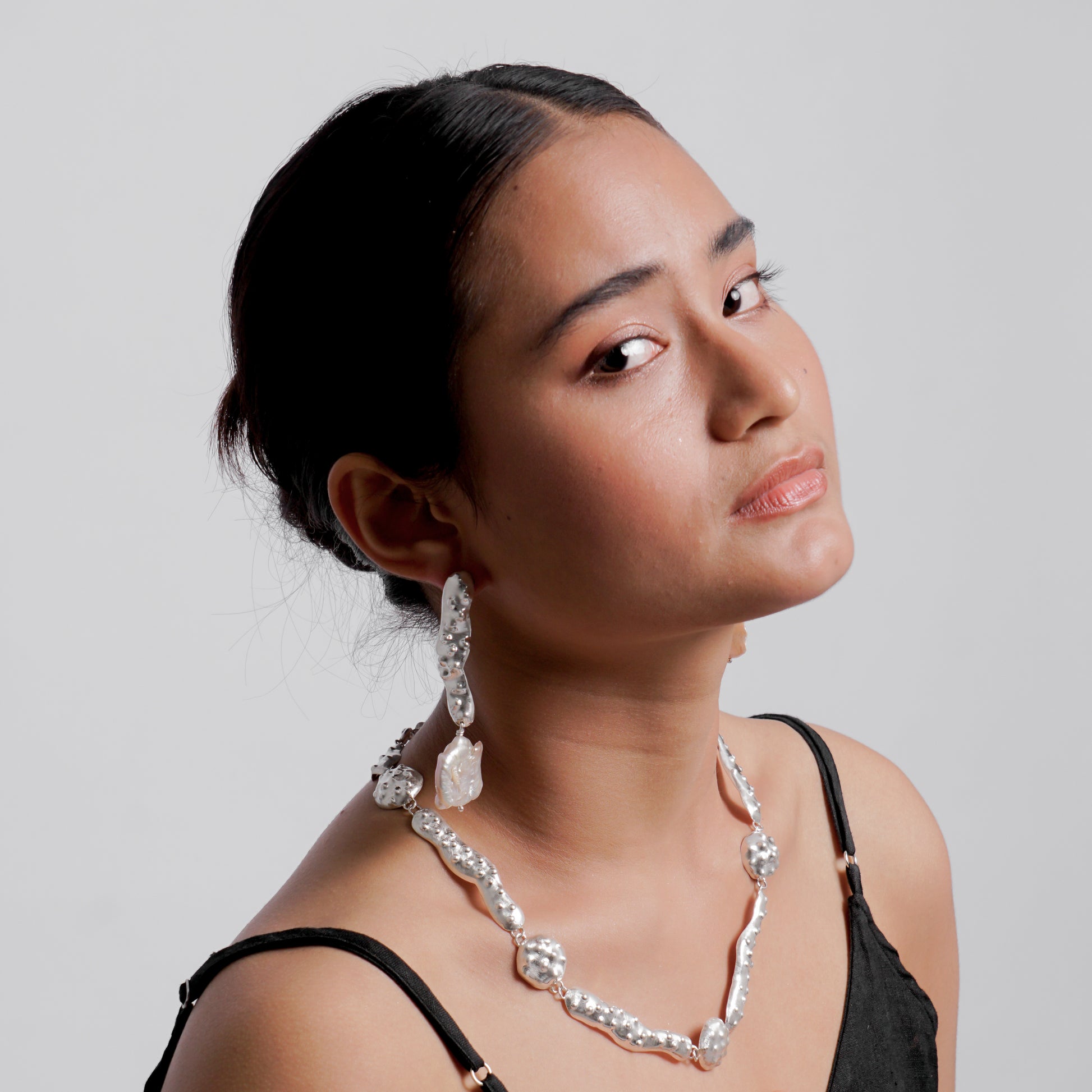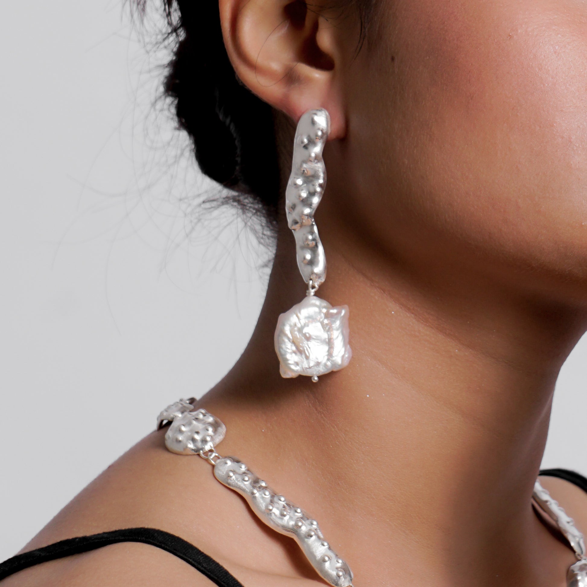 Kaya earrings, crafted in fine silver with hammered texture and unique baroque pearls