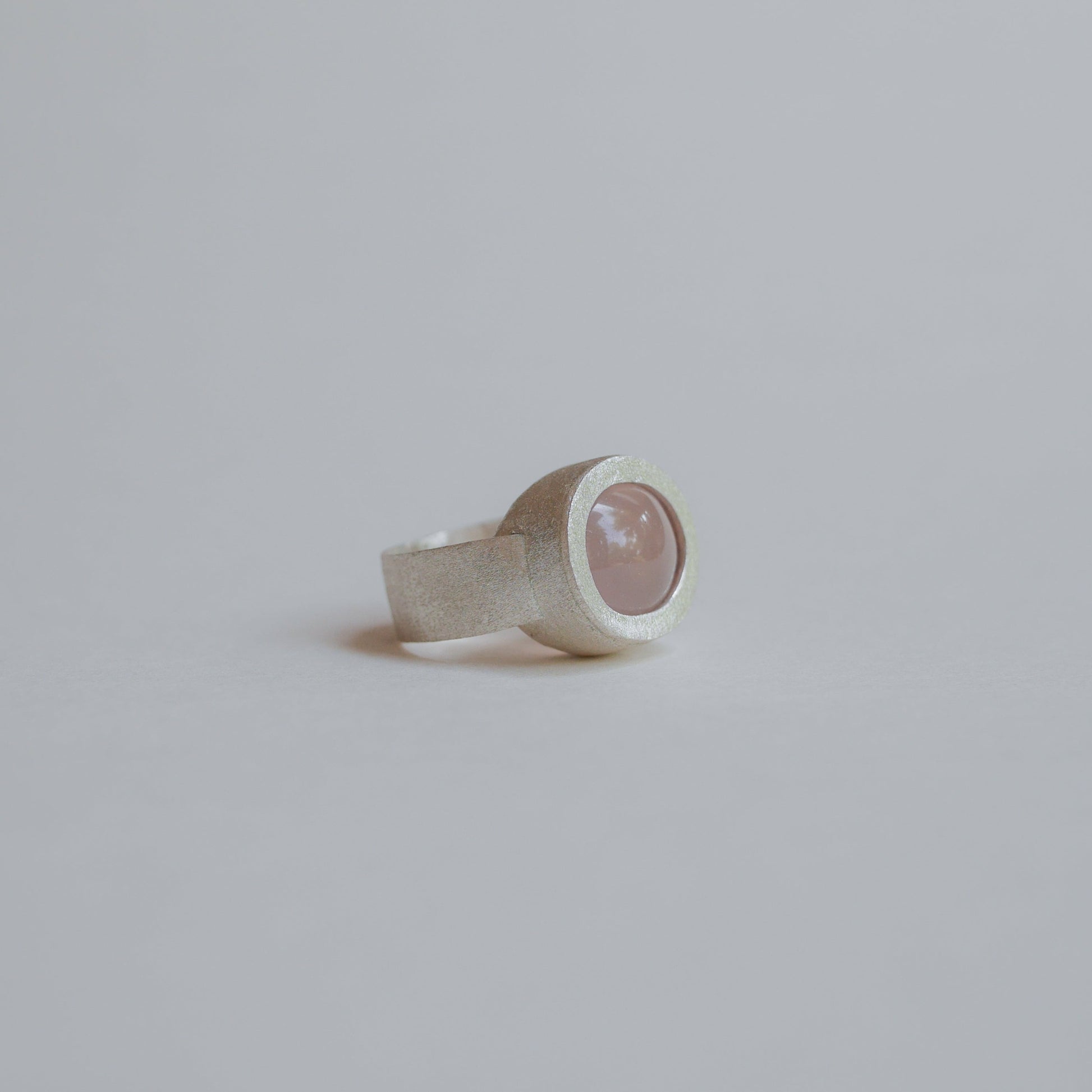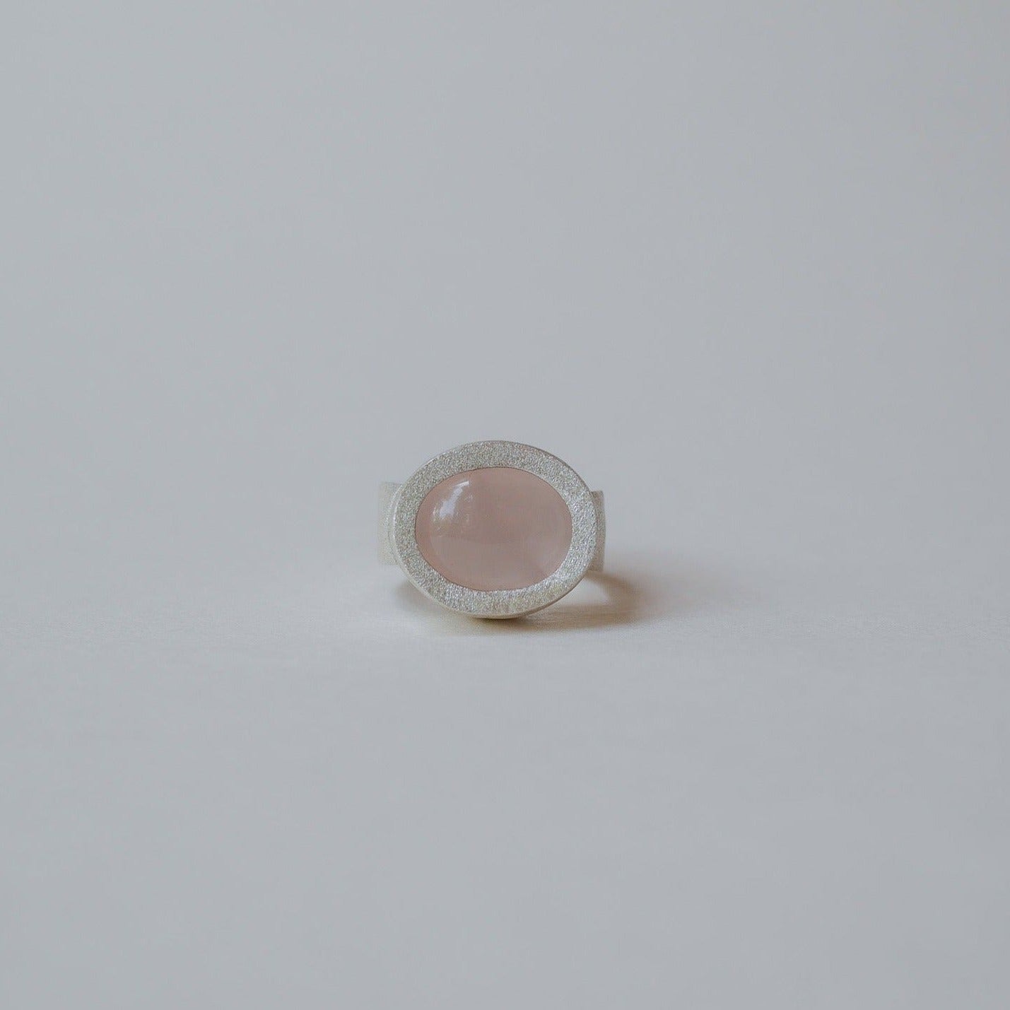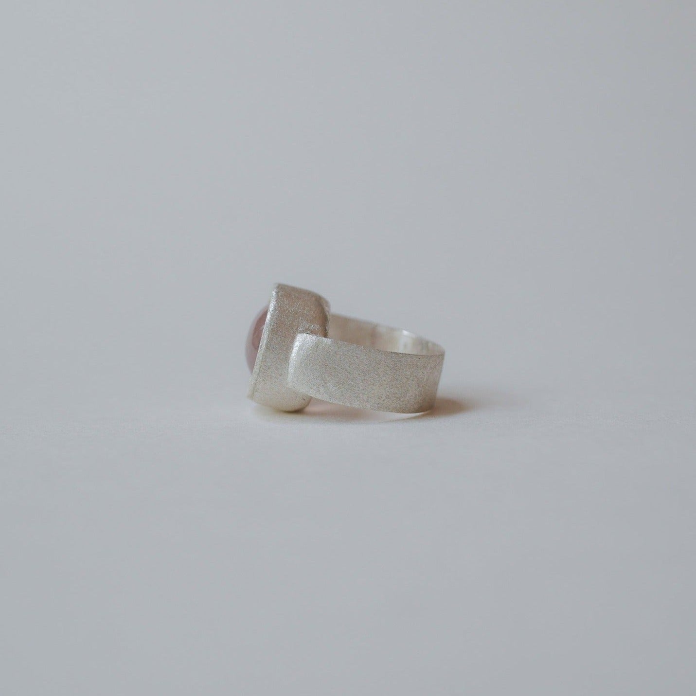 Unique rose quartz ring crafted in fine silver with matte finish