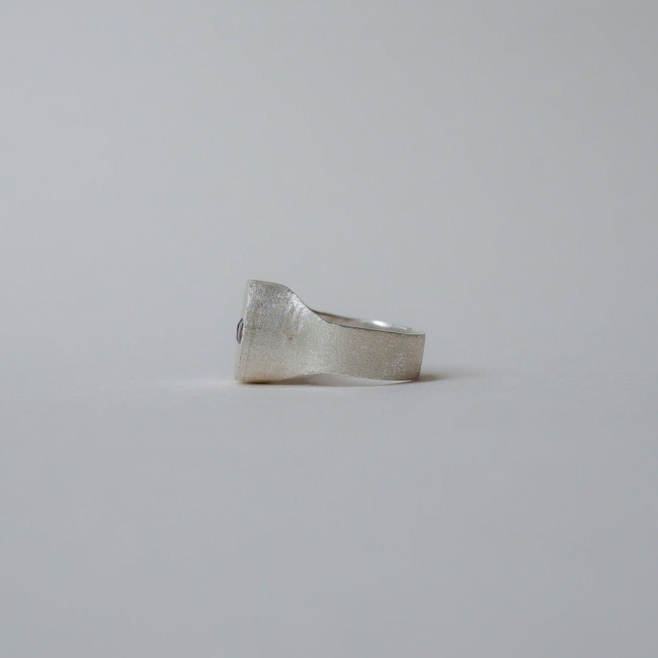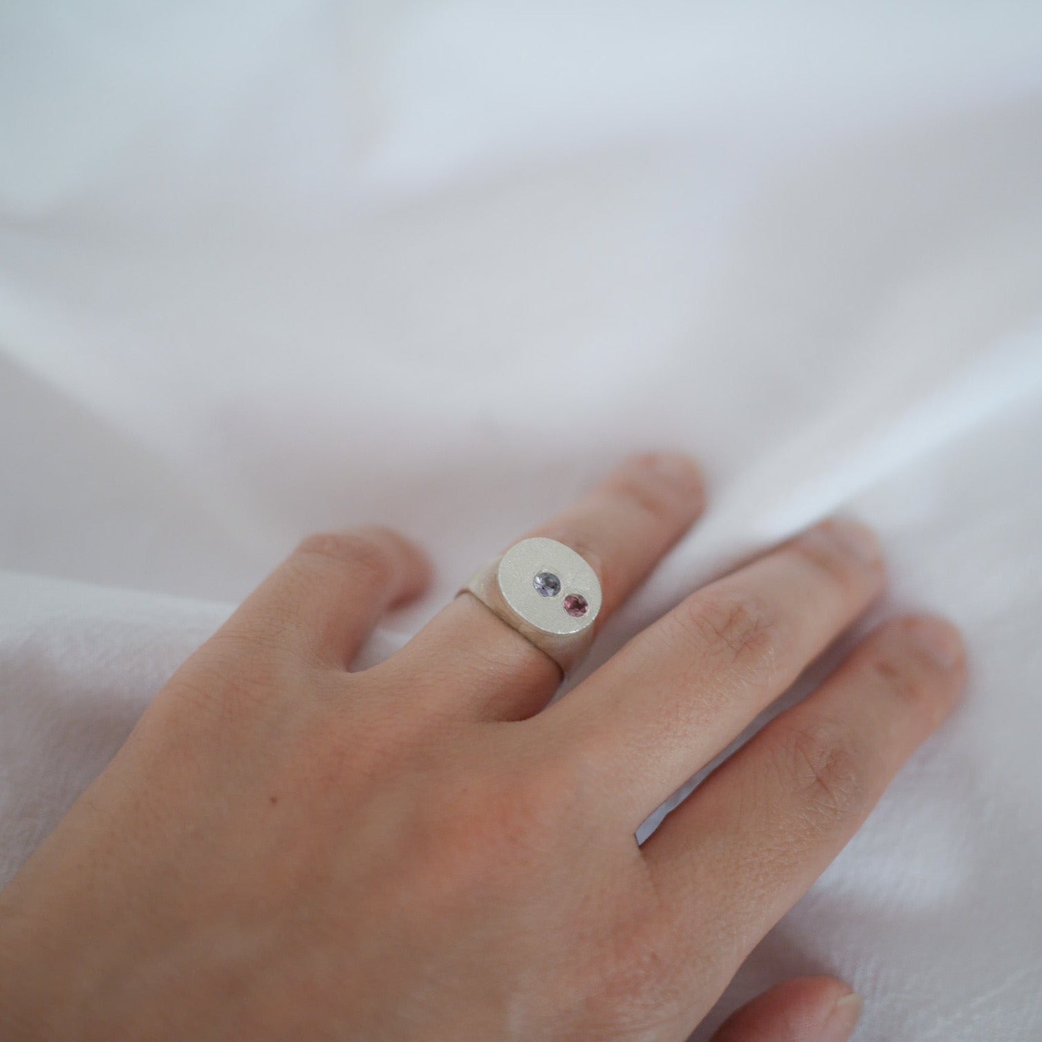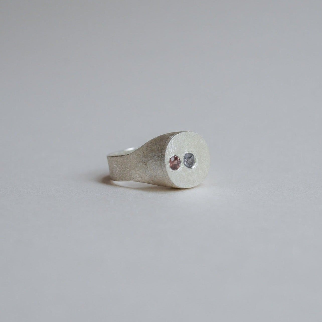 Matte fine silver signet ring with small blue and red spinel gemstones