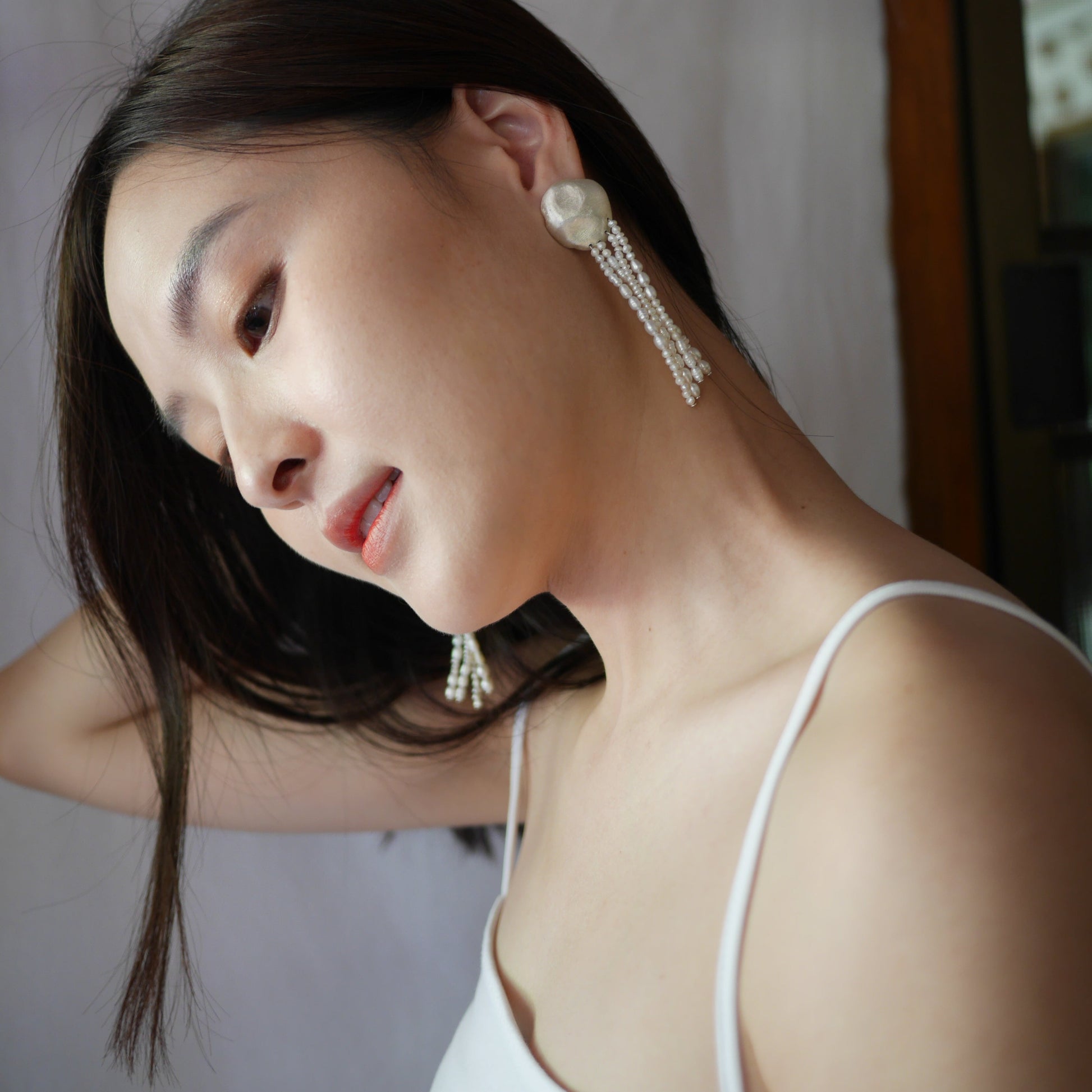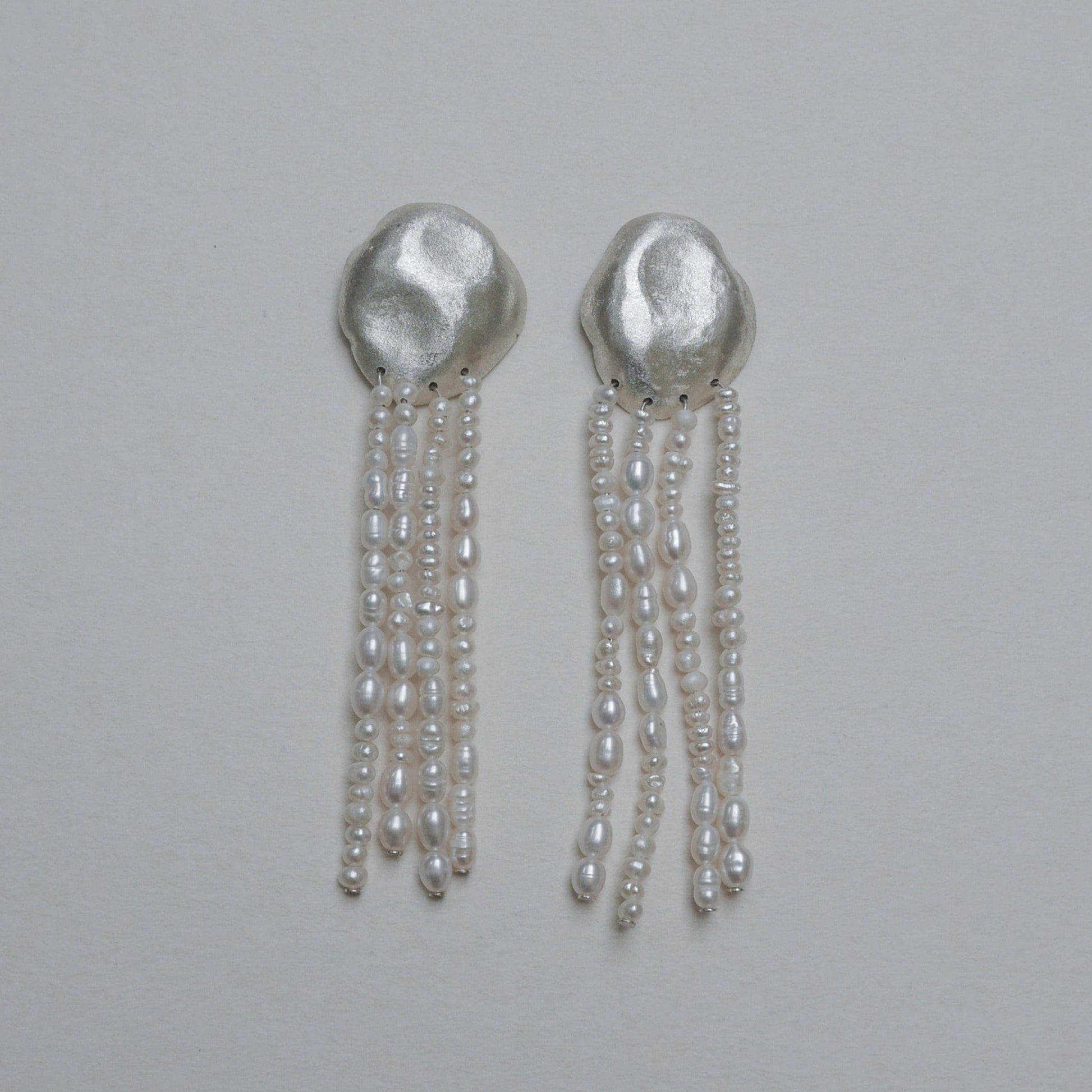 Fine silver earrings adorned with varied sizes of freshwater pearls, matte finish